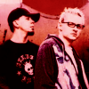 Description: Photograph of Linkin Park vocalists Chester Bennington and Mike Shinoda. The image is tinted in a red hue.