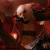 Description: Promotional image of Dante from video game Devil May Cry 3 answering a phone and leaning back in a chair. The image is tinted in a red hue.